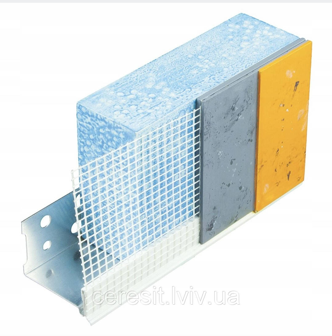 Завершальний профіль кріпиться на цокольну, стартову, планку як крапельник, а виліт сітки служить нахлестом на утеплювачі для забезпечення армування на стиках профілів та утеплювача.
